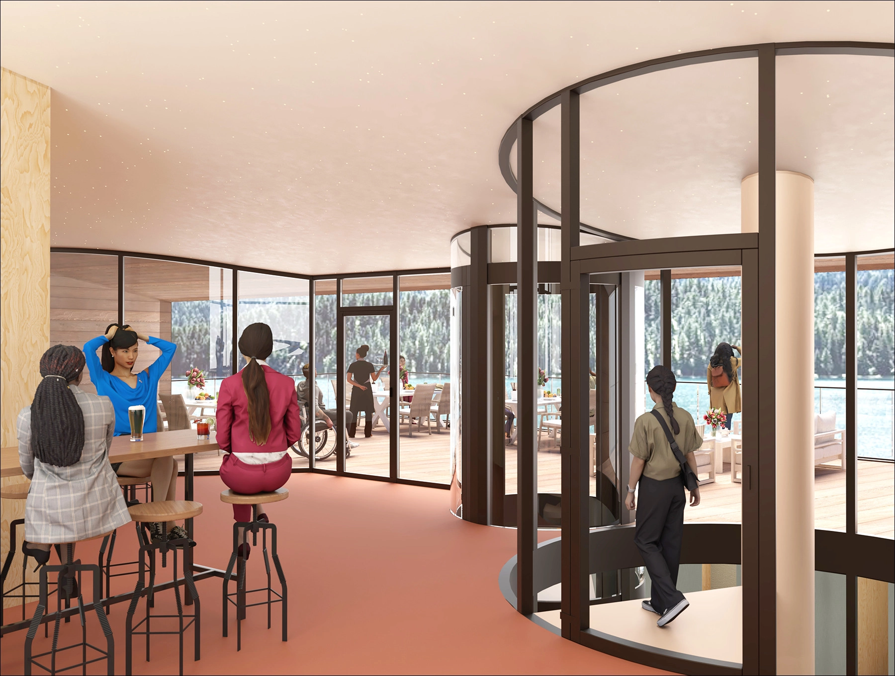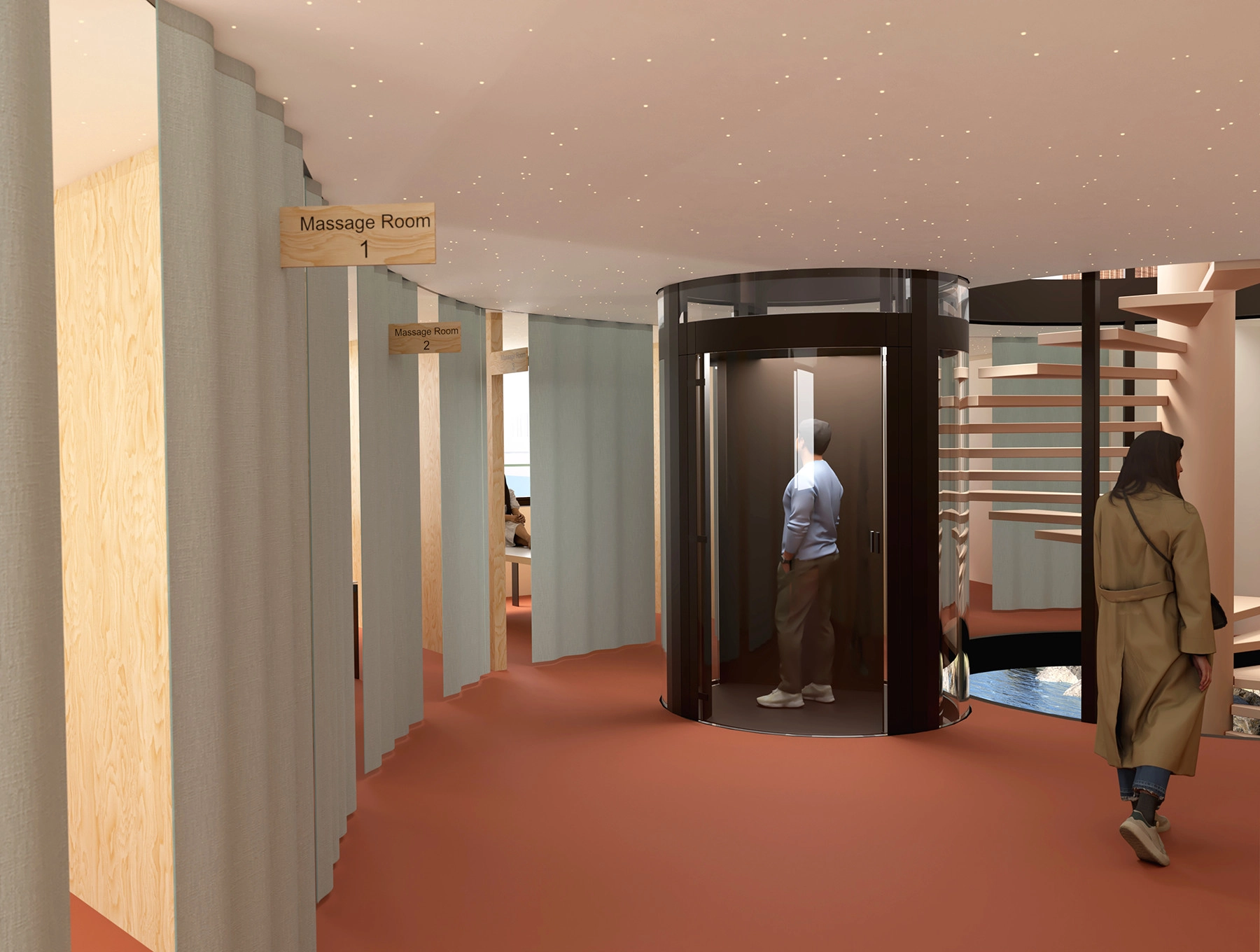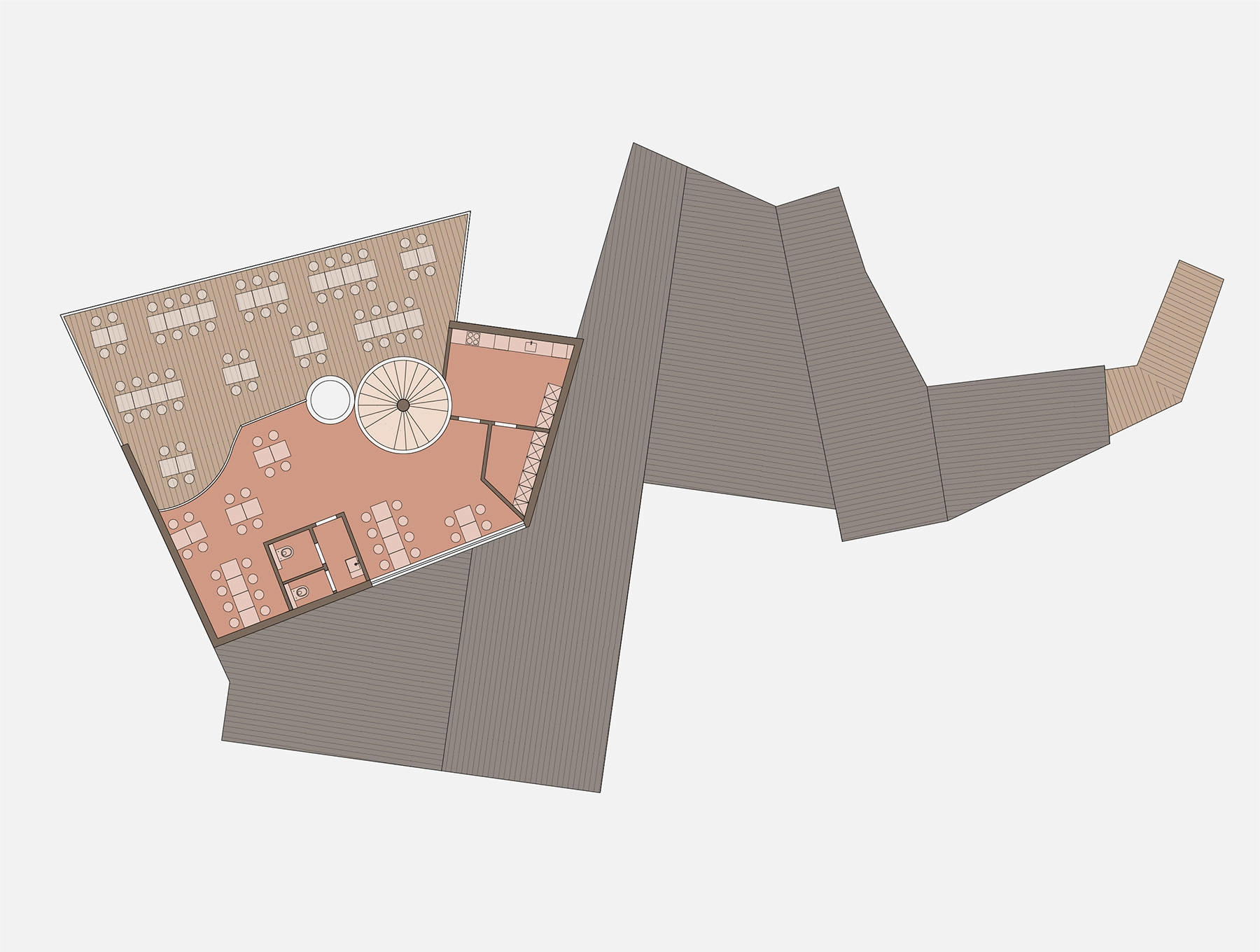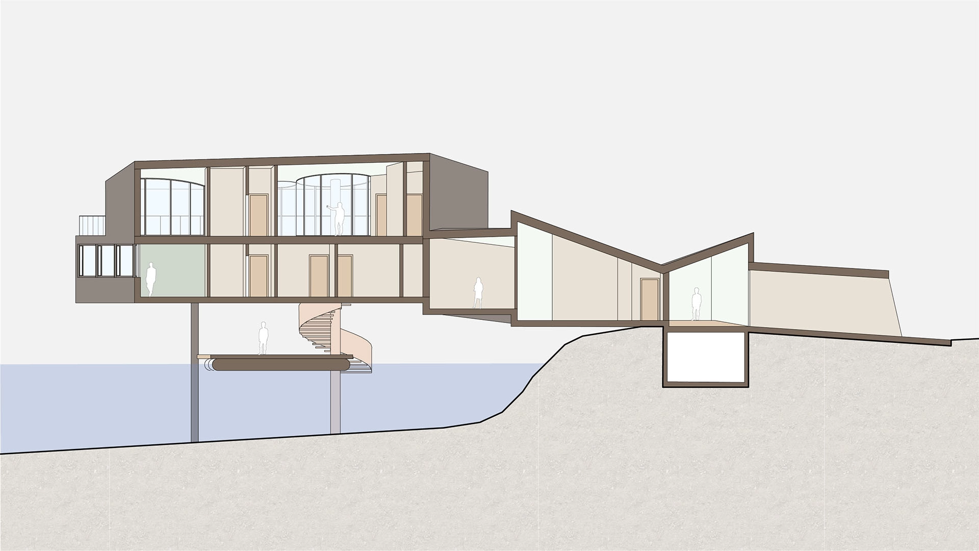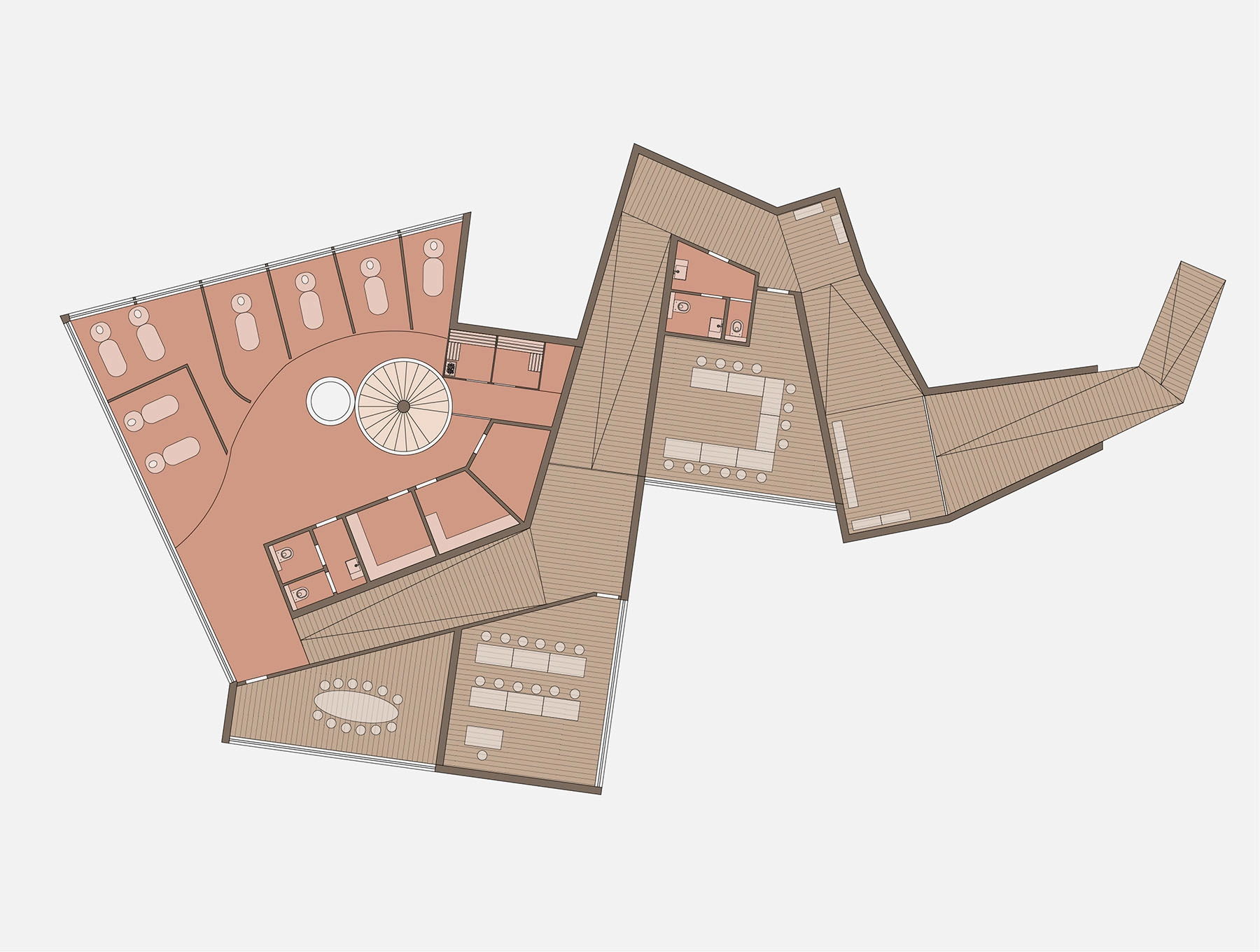 Le parcours, dans des couloirs assez larges pour être utilisés comme espace d’exposition, amène premièrement à différentes salles de réunion avec des orientations et des vues variées. Il finit dans un grand espace wellness avec un escalier en colimaçon, au centre, qui donne un accès direct au lac ou à la cafétéria de l’étage, qui offre une vue imprenable sur le paysage.